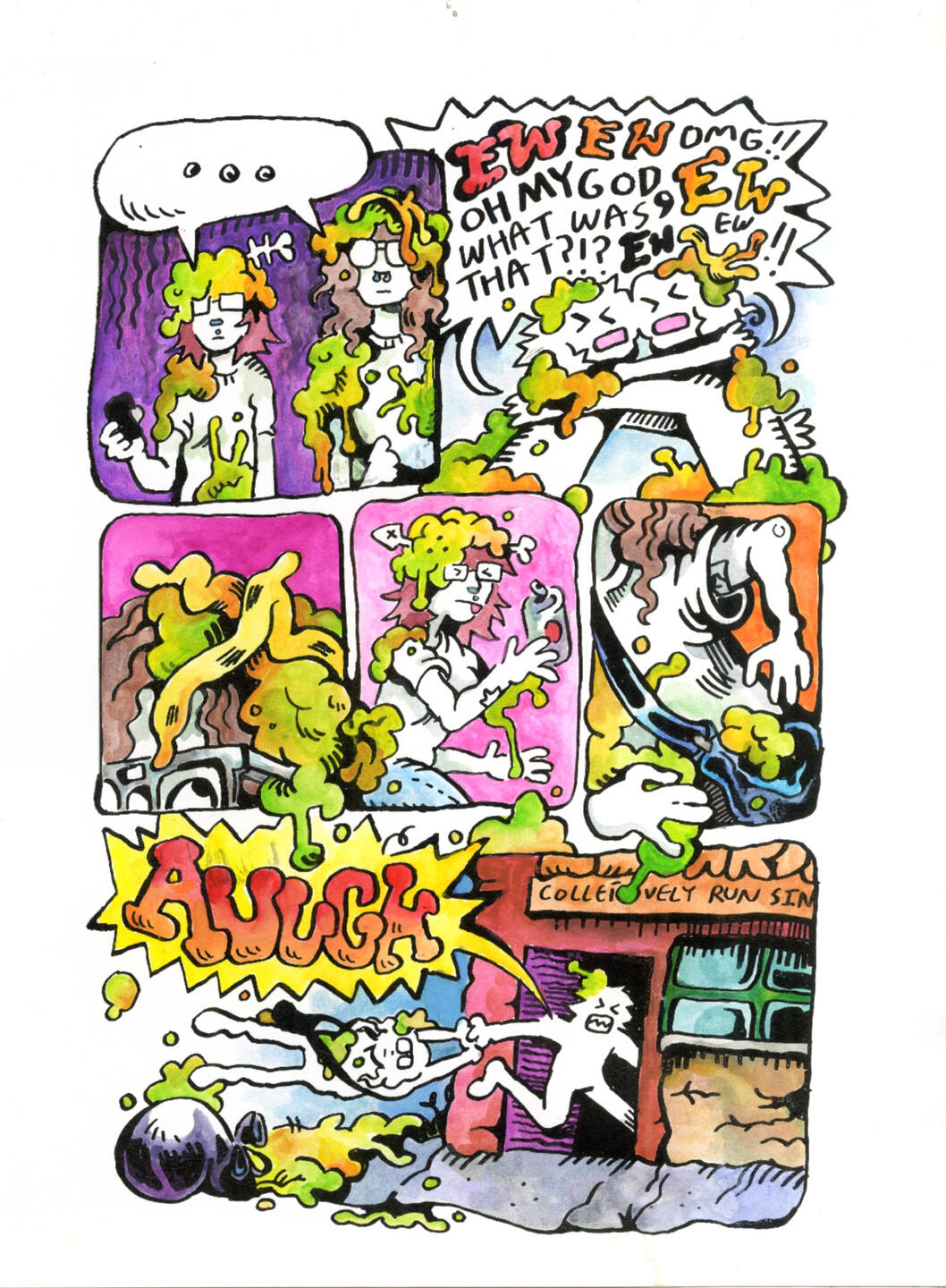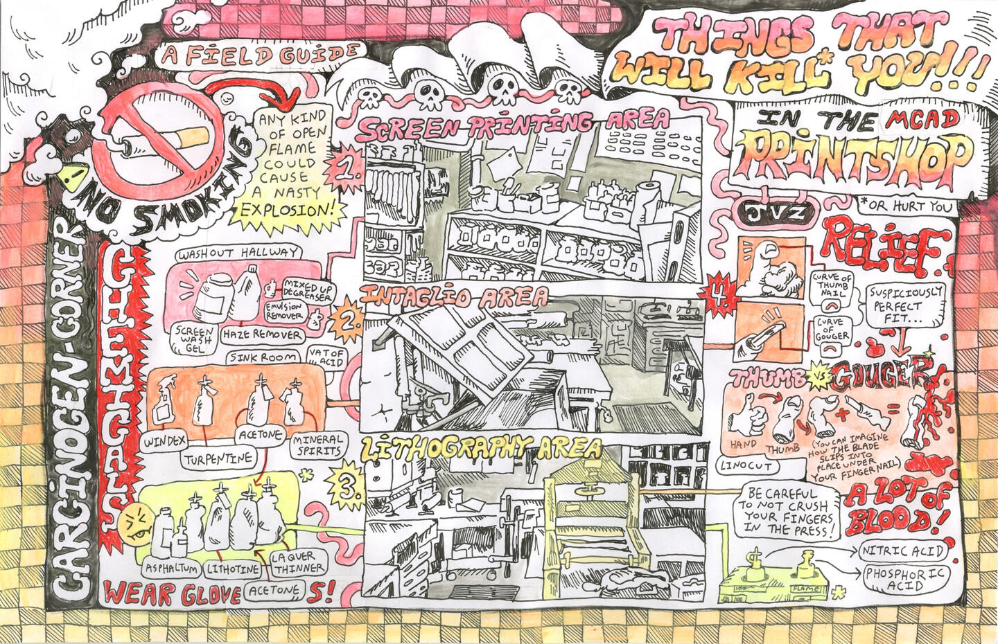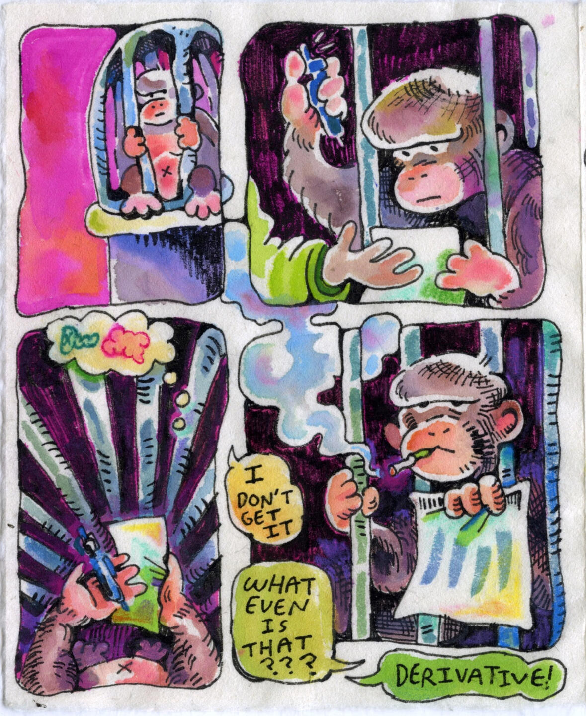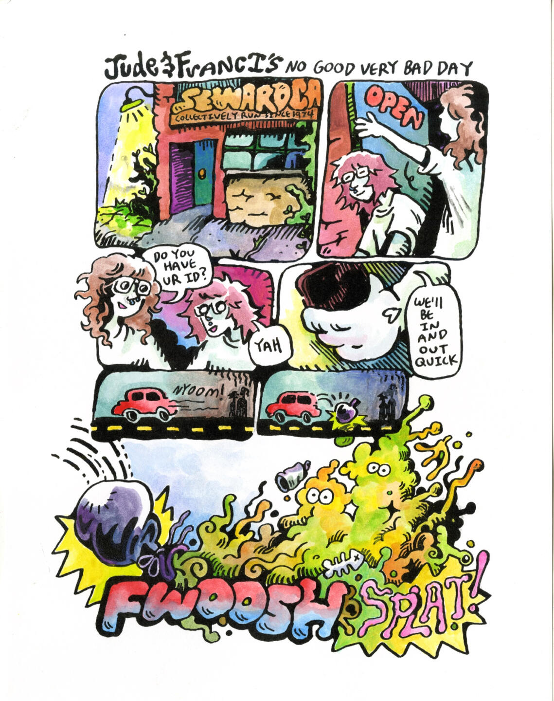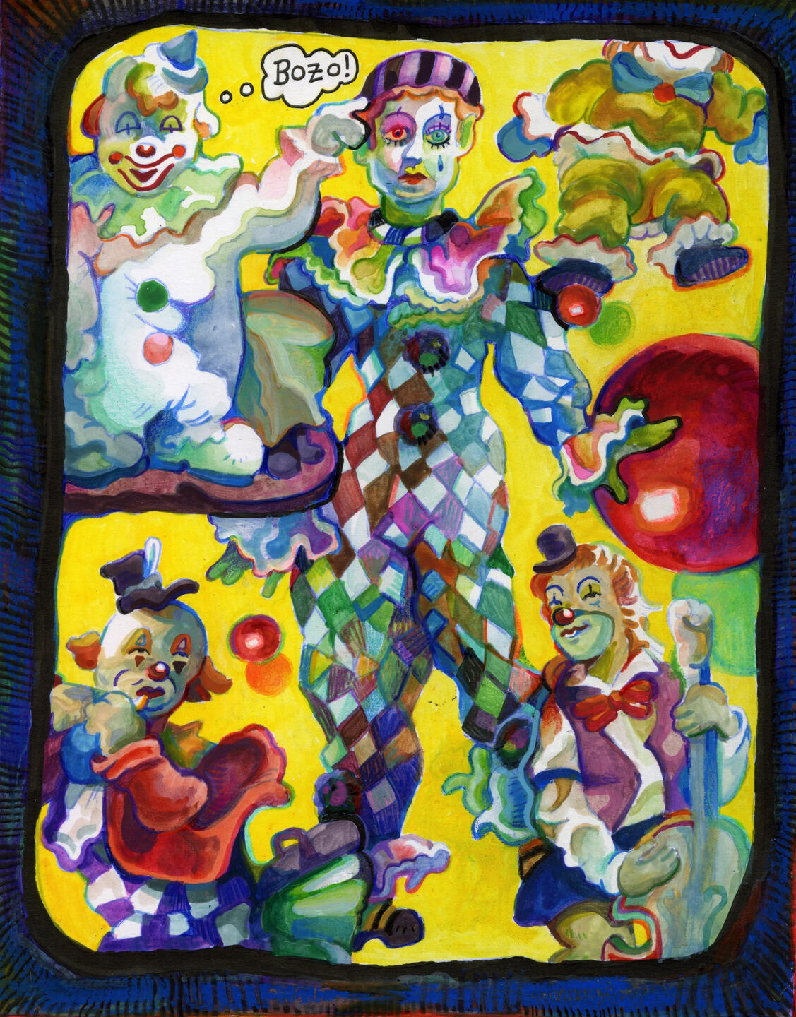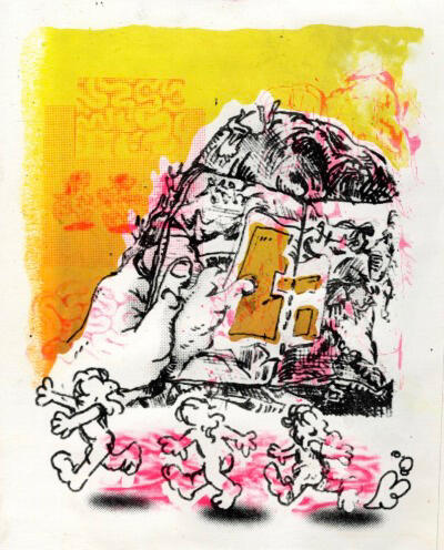 Using bright colors and typography inspired by Comix, Jude Van Zee seeks to bridge the gap between traditionally “higher” arts of painting and printmaking and the lowbrow motifs one would find in a sunday newspaper or ephemeral post online.